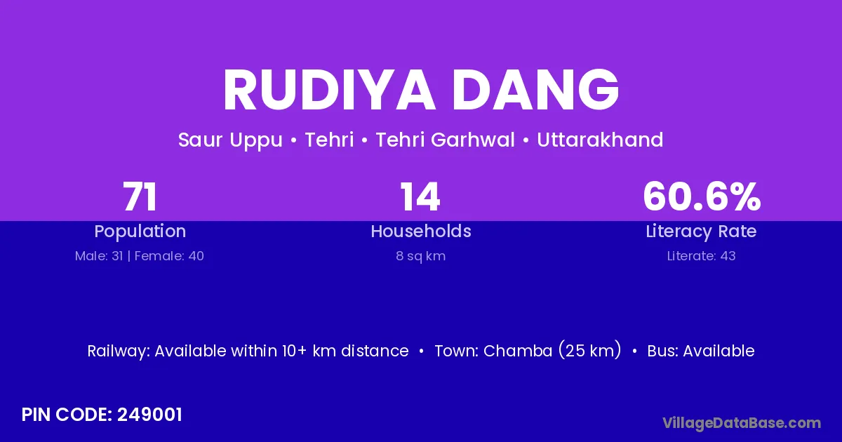 Chamba (25 km) is the nearest town to Rudiya Dang village for major economic activities and is located approximately 25 km away.