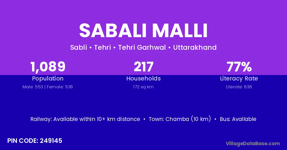 Chamba (10 km) is the nearest town to Sabali Malli village for major economic activities and is located approximately 10 km away.