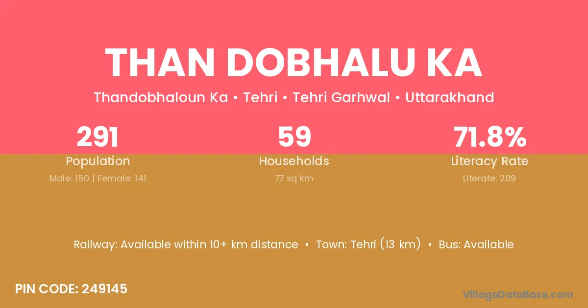 Tehri (13 km) is the nearest town to Than Dobhalu Ka village for major economic activities and is located approximately 13 km away.
