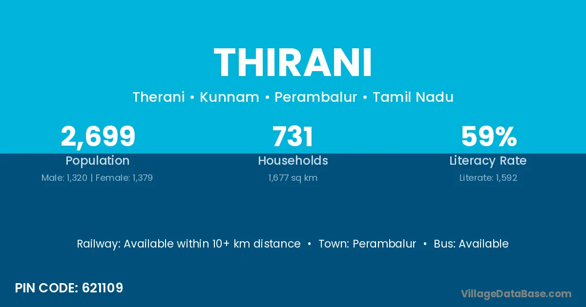 The literacy rate of Thirani village is 68.31%. Male literacy stands at 73.81% and female literacy at 63.64%.