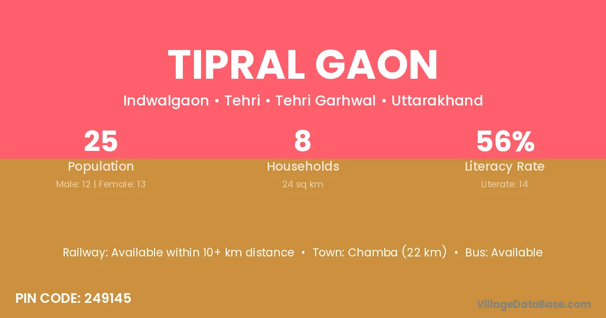 Chamba (22 km) is the nearest town to Tipral Gaon village for major economic activities and is located approximately 22 km away.