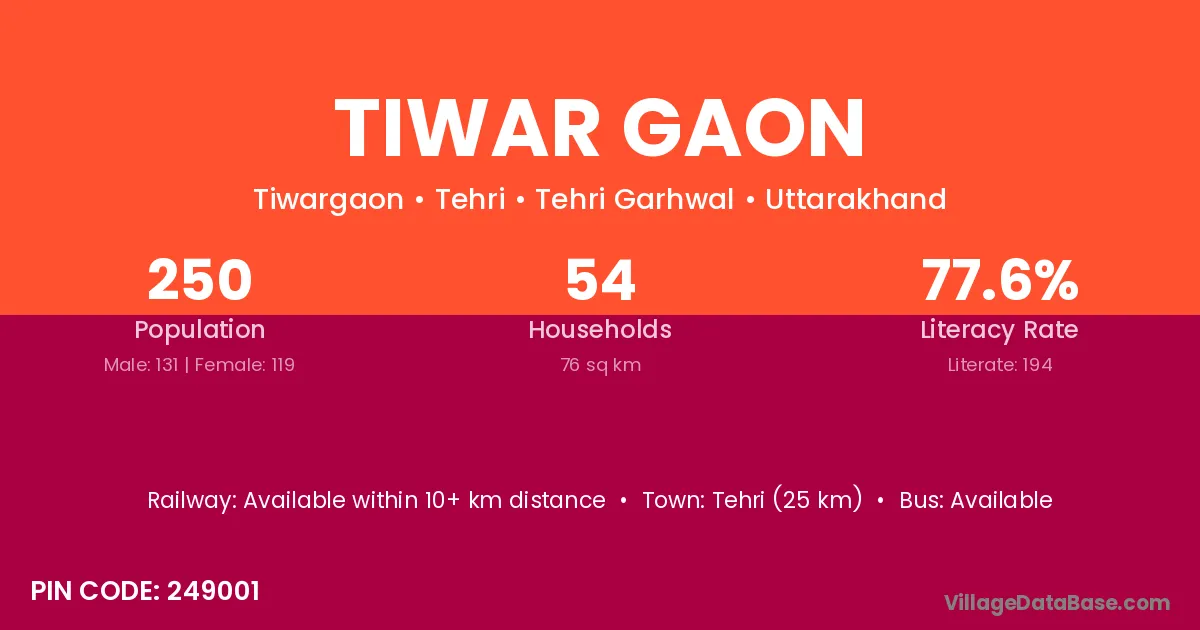 Tiwar Gaon village has a total population of 250 people, of which 131 are males and 119 are females.