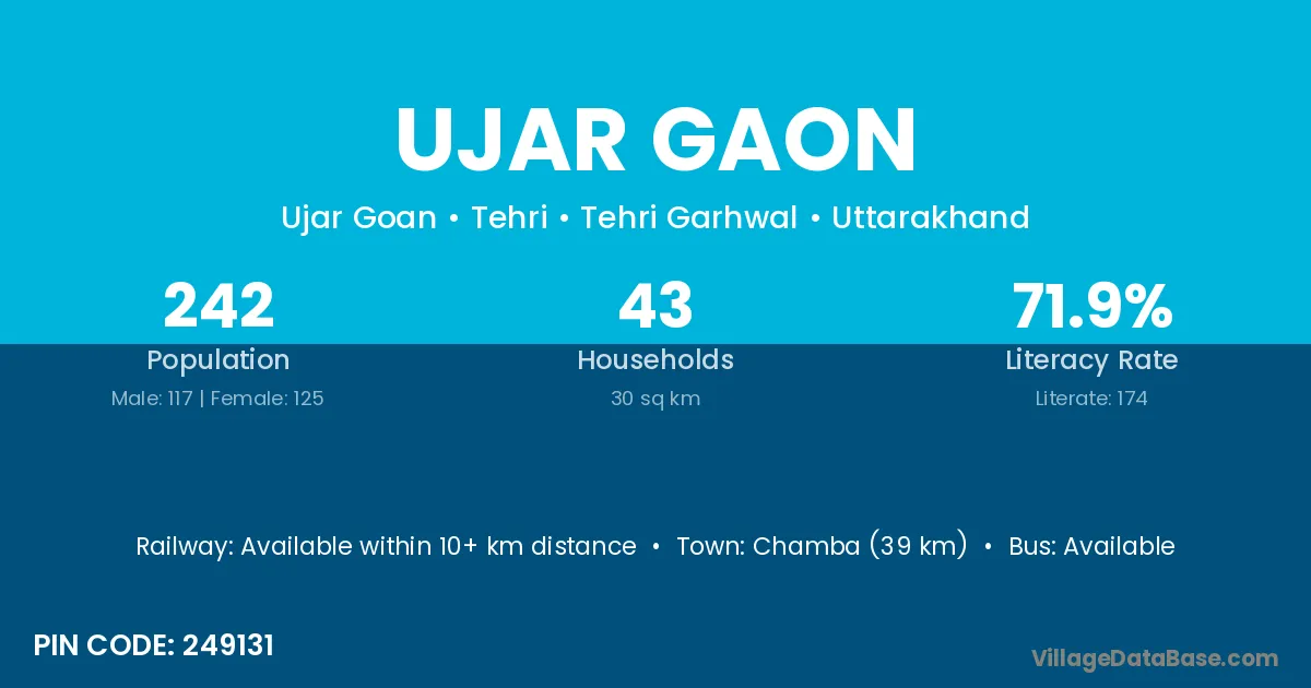 Chamba (39 km) is the nearest town to Ujar Gaon village for major economic activities and is located approximately 39 km away.