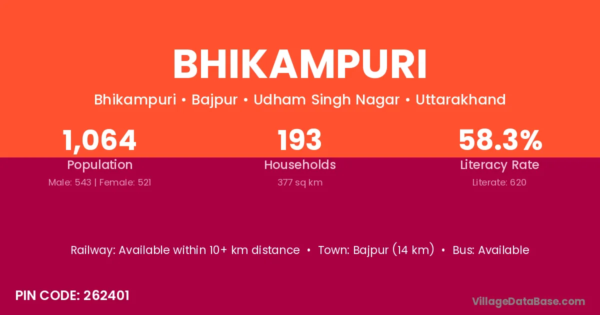 Bhikampuri village has a total population of 1,064 people, of which 543 are males and 521 are females.