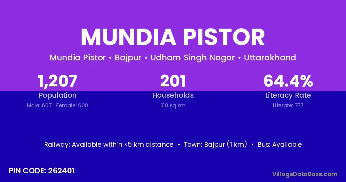 Bajpur (1 km) is the nearest town to Mundia Pistor village for major economic activities and is located approximately 1 km away.