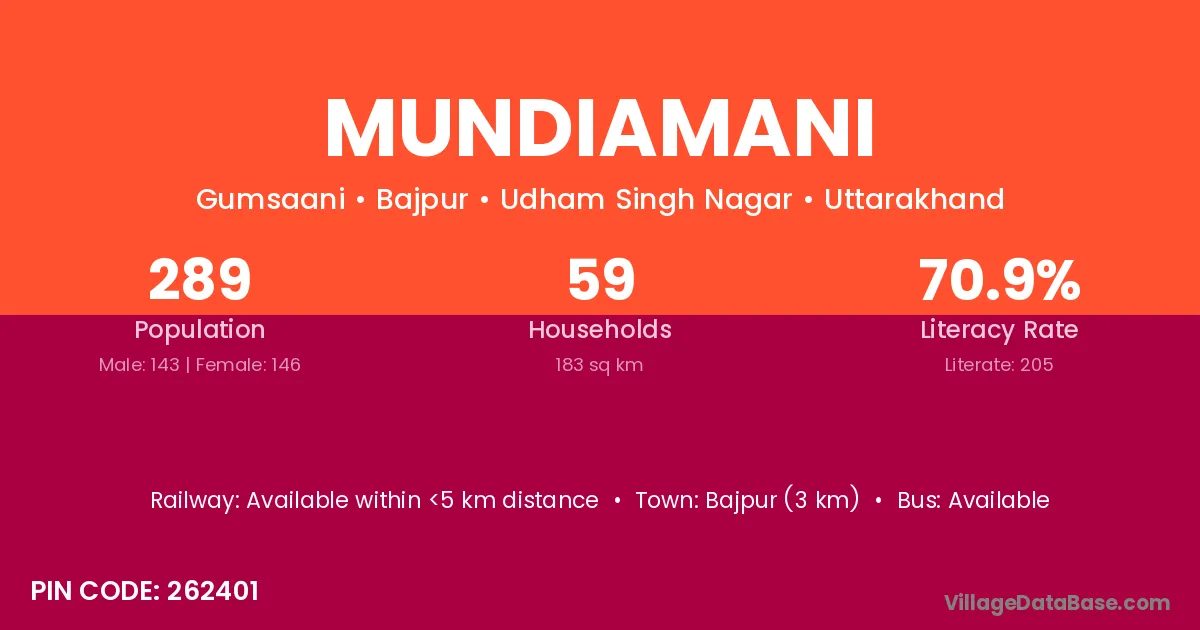 Mundiamani village has a total population of 289 people, of which 143 are males and 146 are females.