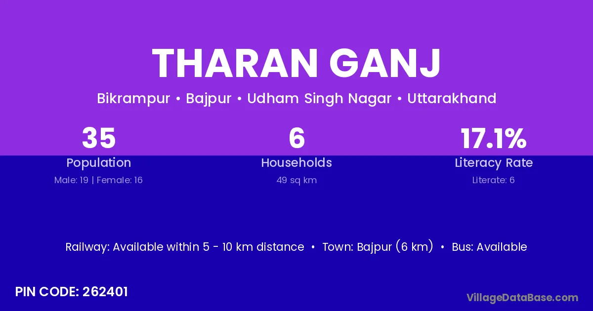 Bajpur (6 km) is the nearest town to Tharan Ganj village for major economic activities and is located approximately 6 km away.