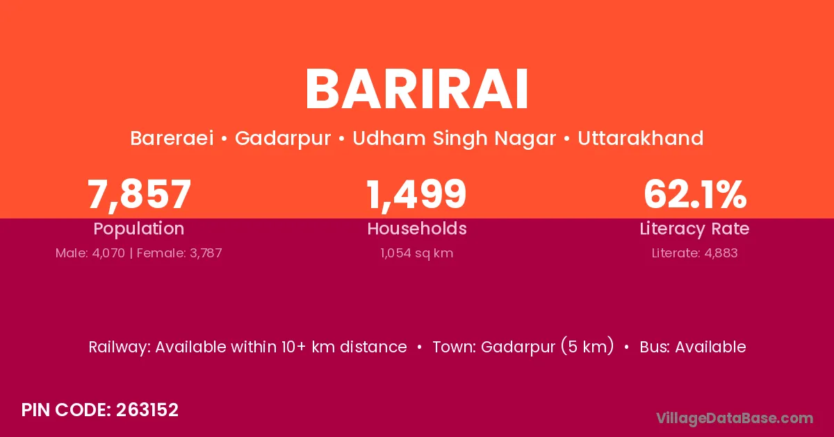 Gadarpur (5 km) is the nearest town to Barirai village for major economic activities and is located approximately 5 km away.