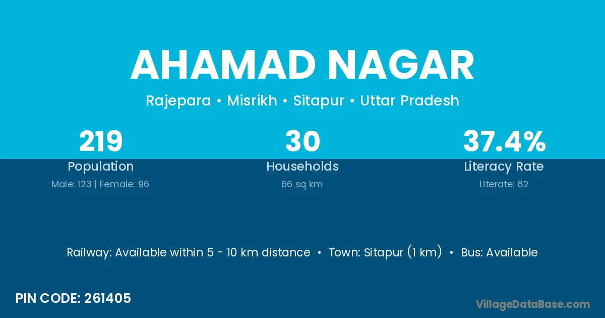 Jaspur (6 km) is the nearest town to Ahamad Nagar village for major economic activities and is located approximately 6 km away.