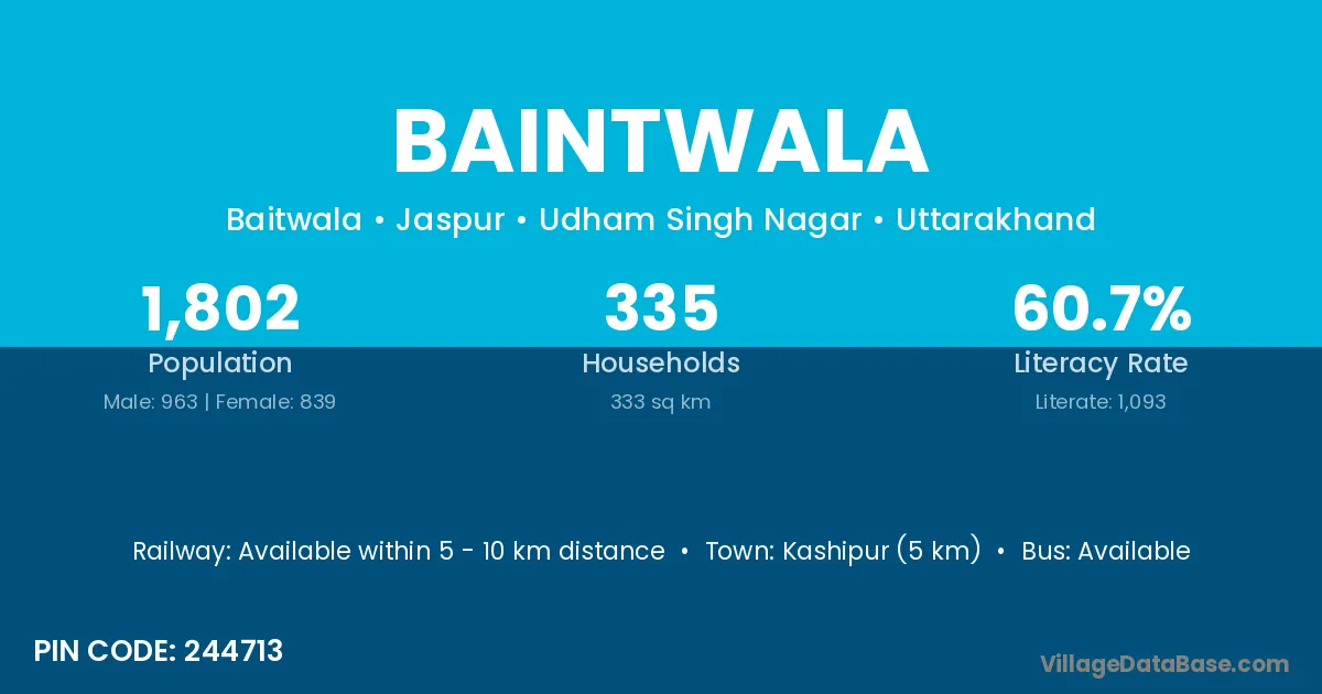 Kashipur (5 km) is the nearest town to Baintwala village for major economic activities and is located approximately 5 km away.