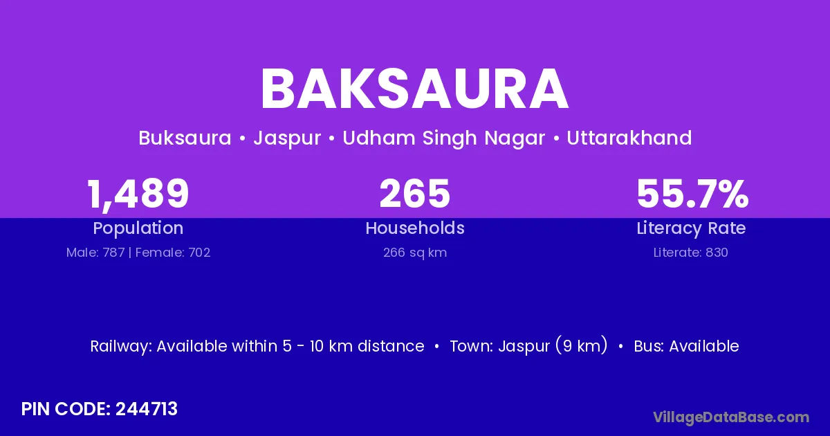 Baksaura village has a total population of 1,489 people, of which 787 are males and 702 are females.