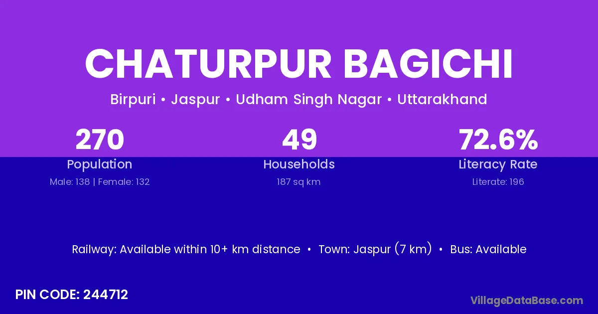 Chaturpur Bagichi village has a total population of 270 people, of which 138 are males and 132 are females.