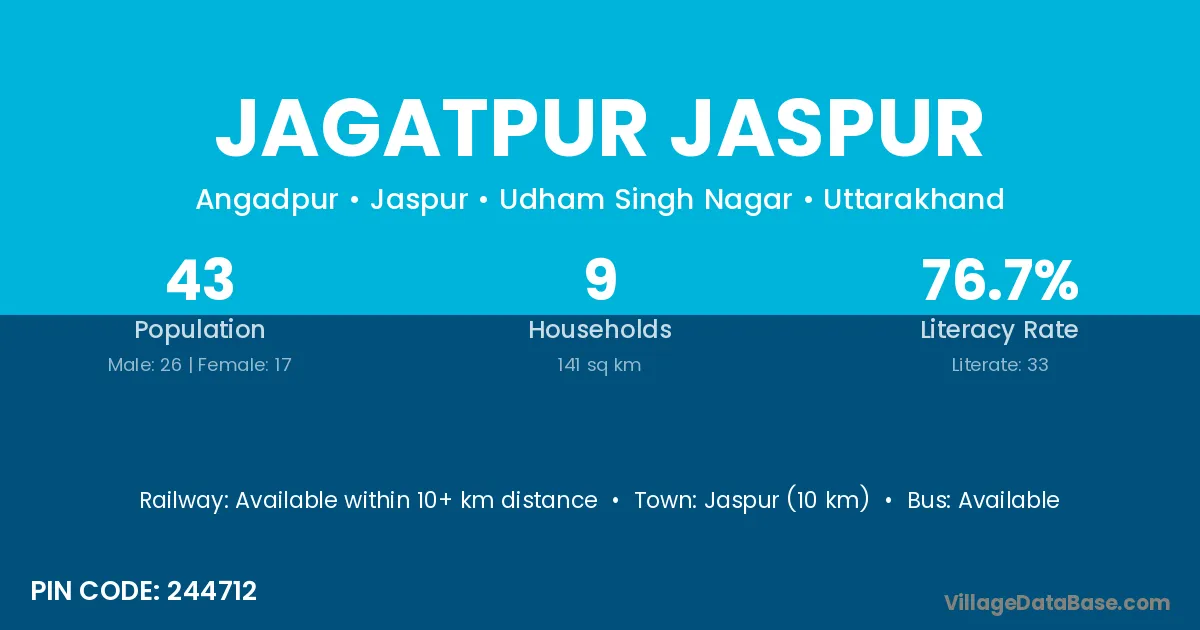 Jagatpur Jaspur village has a total population of 43 people, of which 26 are males and 17 are females.