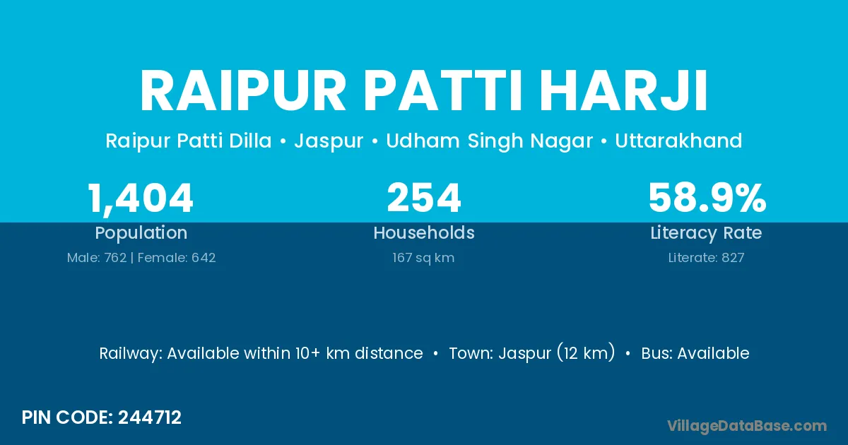 Jaspur (12 km) is the nearest town to Raipur Patti Harji village for major economic activities and is located approximately 12 km away.