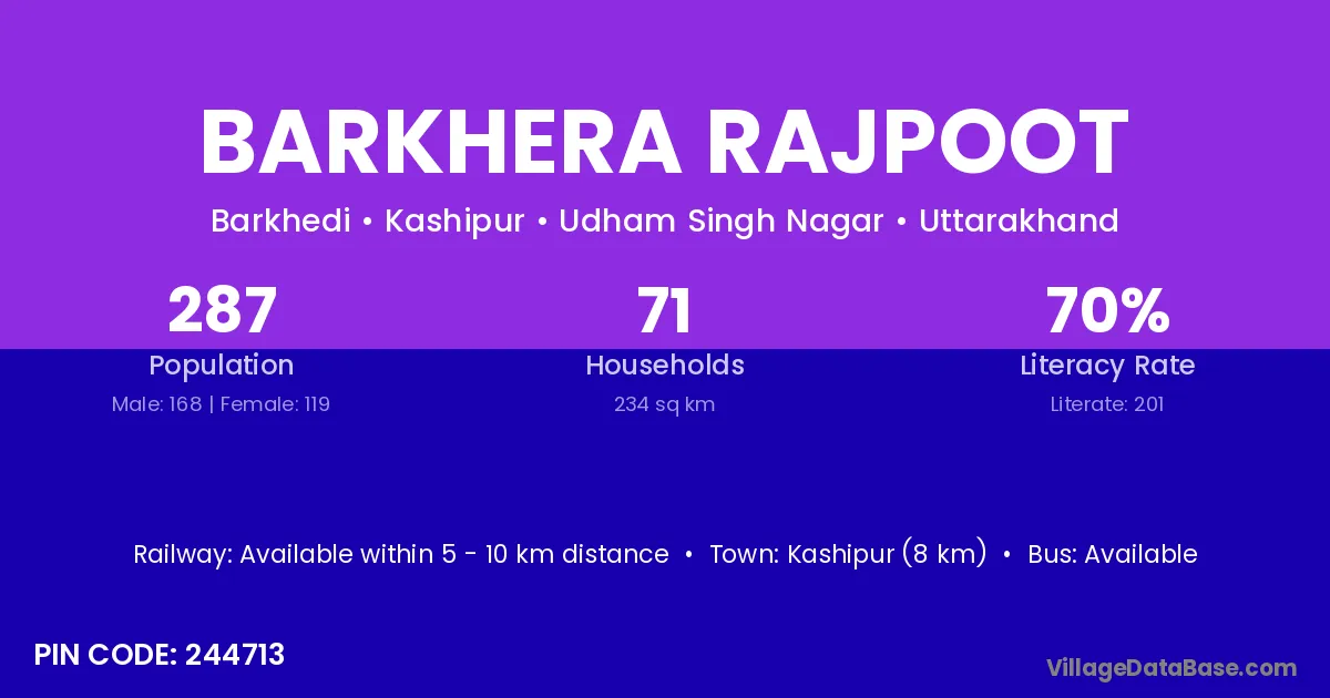 Kashipur (8 km) is the nearest town to Barkhera Rajpoot village for major economic activities and is located approximately 8 km away.