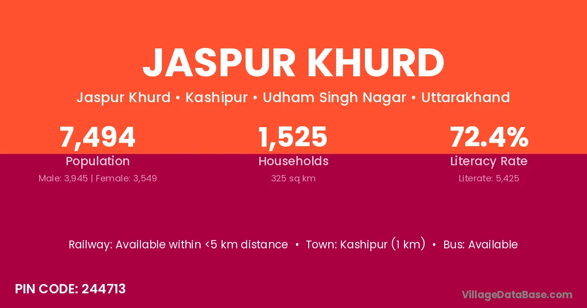 Kashipur (1 km) is the nearest town to Jaspur Khurd village for major economic activities and is located approximately 1 km away.