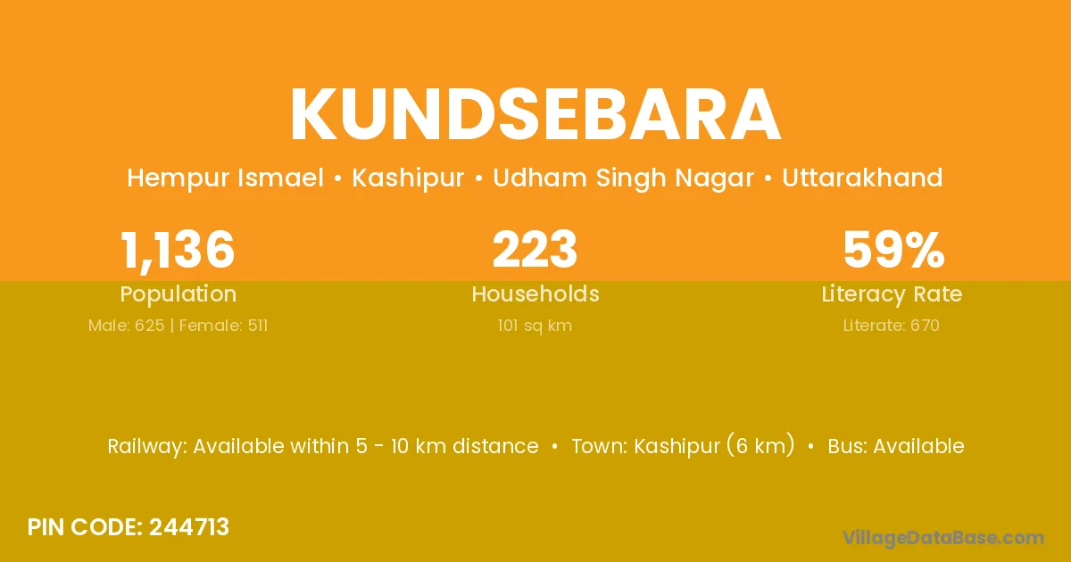 Kundsebara village has a total population of 1,136 people, of which 625 are males and 511 are females.