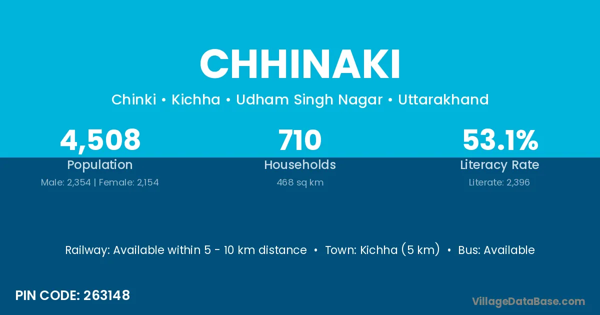 Kichha (5 km) is the nearest town to Chhinaki village for major economic activities and is located approximately 5 km away.