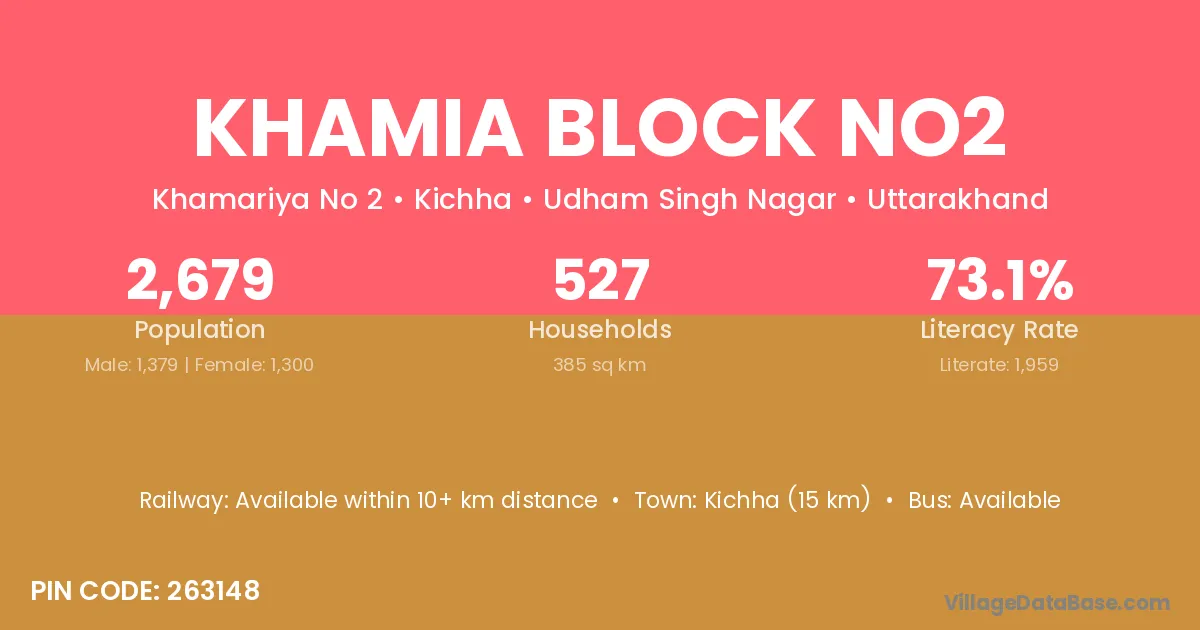 Kichha (15 km) is the nearest town to Khamia Block No2 village for major economic activities and is located approximately 15 km away.