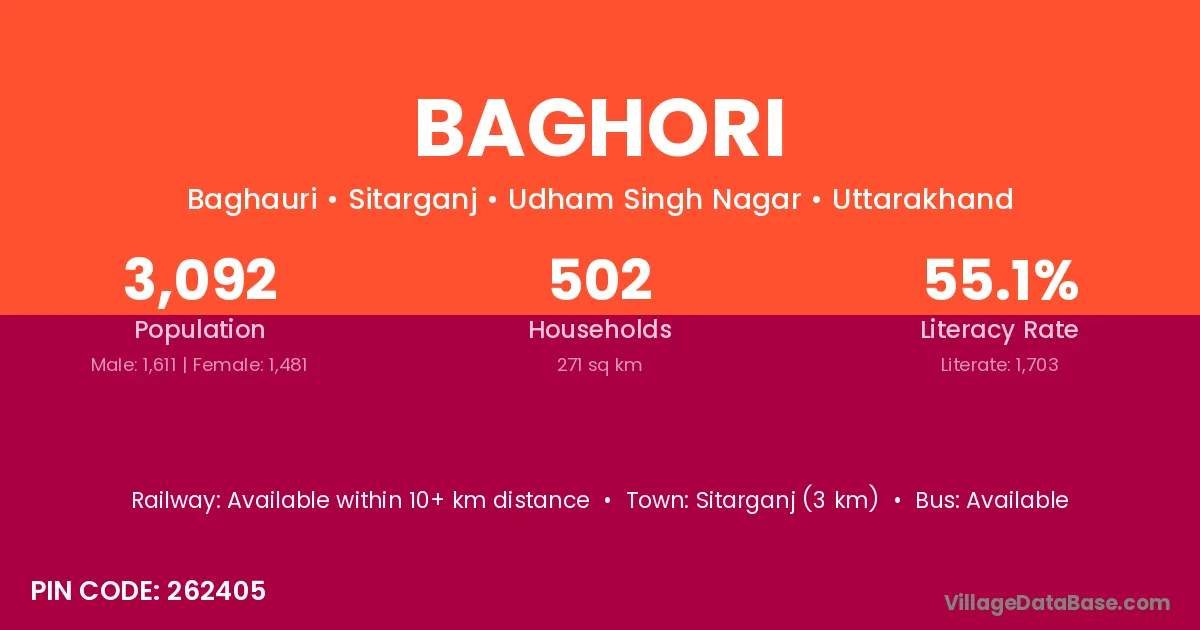 Sitarganj (3 km) is the nearest town to Baghori village for major economic activities and is located approximately 3 km away.