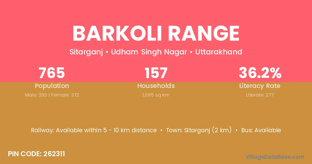 Sitarganj (2 km) is the nearest town to Barkoli Range village for major economic activities and is located approximately 2 km away.