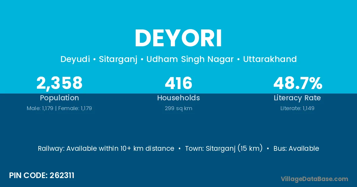 Sitarganj (15 km) is the nearest town to Deyori village for major economic activities and is located approximately 15 km away.