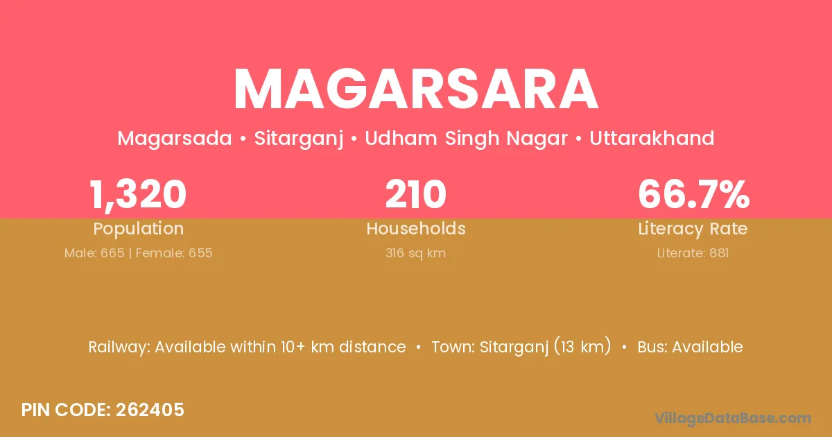 Sitarganj (13 km) is the nearest town to Magarsara village for major economic activities and is located approximately 13 km away.