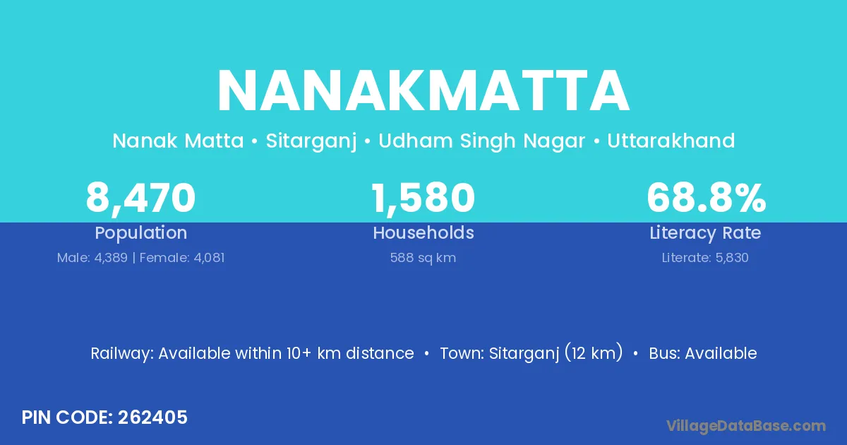 Sitarganj (12 km) is the nearest town to Nanakmatta village for major economic activities and is located approximately 12 km away.