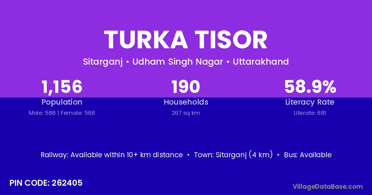 Sitarganj (4 km) is the nearest town to Turka Tisor village for major economic activities and is located approximately 4 km away.