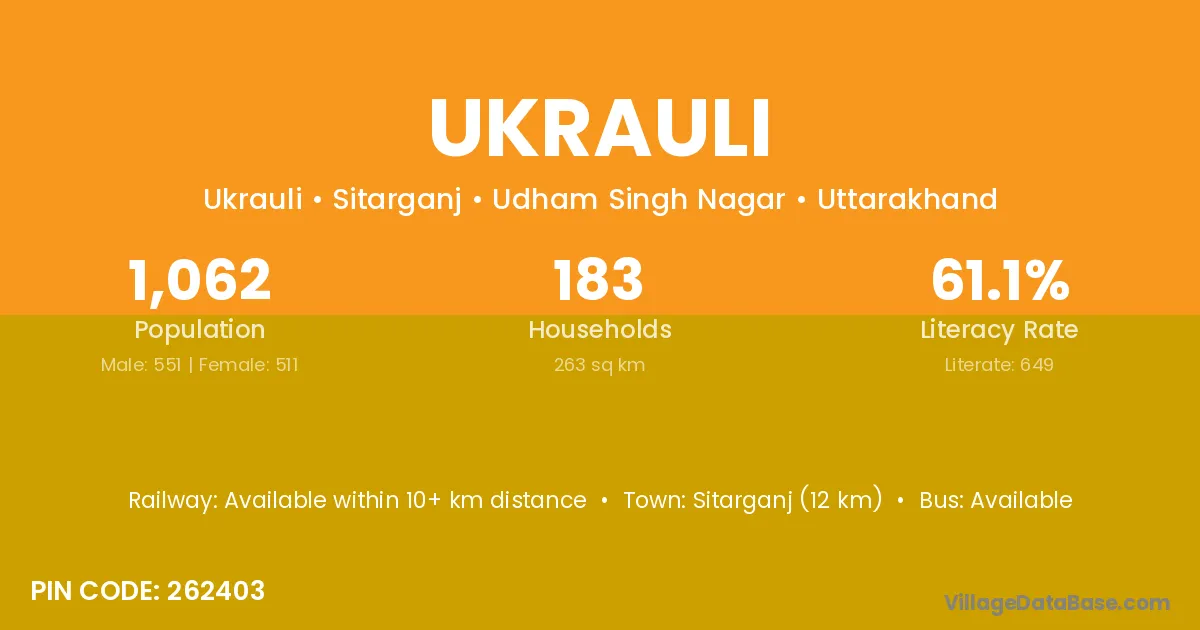 Sitarganj (12 km) is the nearest town to Ukrauli village for major economic activities and is located approximately 12 km away.