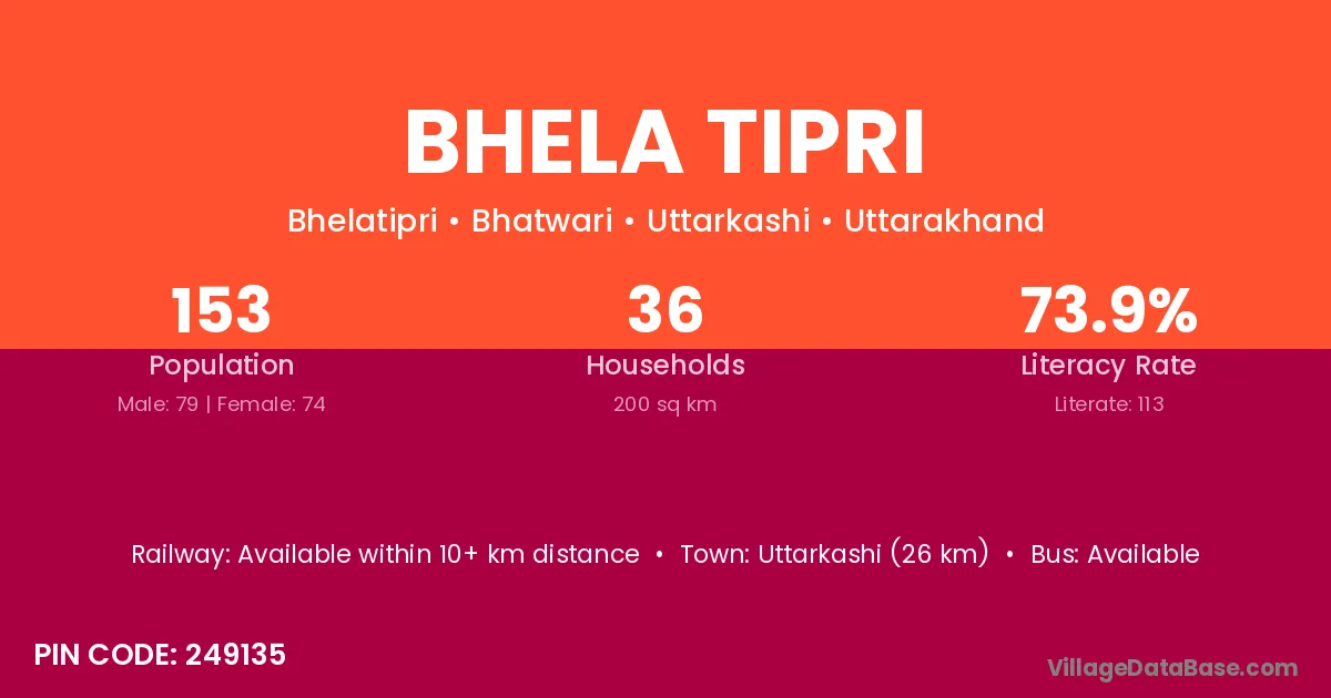 Uttarkashi (26 km) is the nearest town to Bhela Tipri village for major economic activities and is located approximately 26 km away.