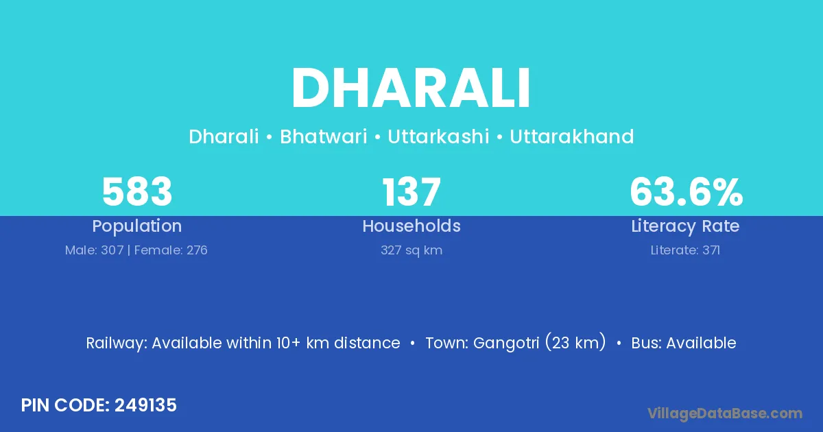 Dharali village has a total population of 583 people, of which 307 are males and 276 are females.