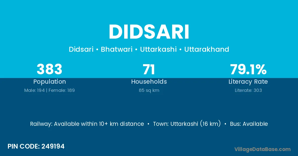 Uttarkashi (16 km) is the nearest town to Didsari village for major economic activities and is located approximately 16 km away.