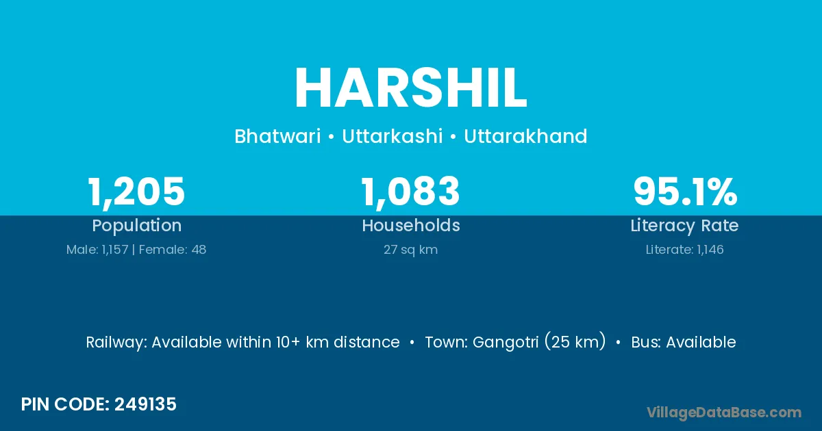 Harshil village has a total population of 1,205 people, of which 1,157 are males and 48 are females.