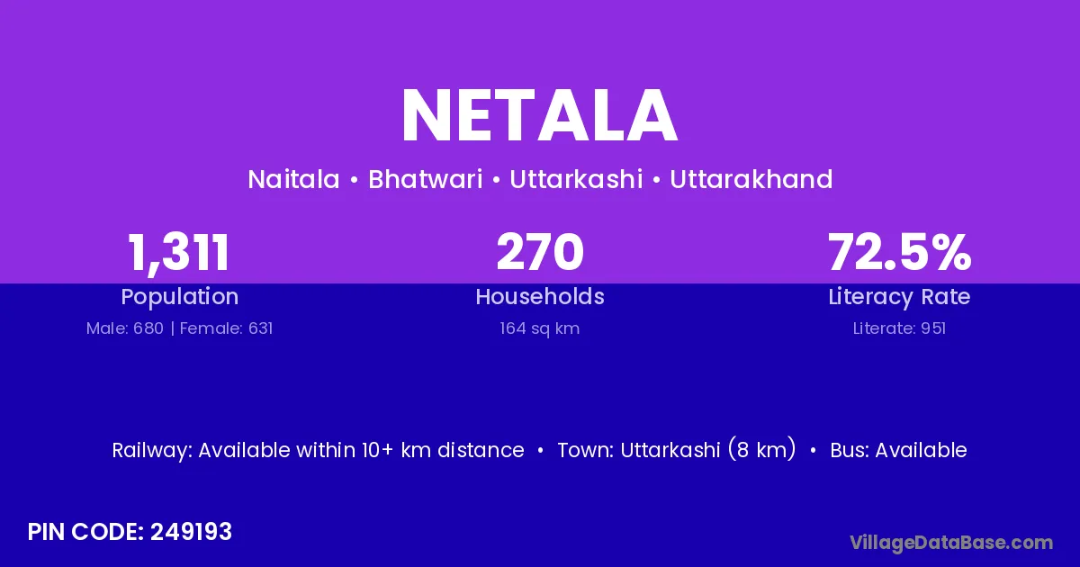 Uttarkashi (8 km) is the nearest town to Netala village for major economic activities and is located approximately 8 km away.