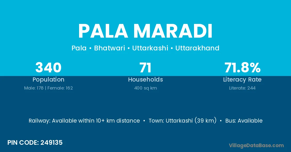 Uttarkashi (39 km) is the nearest town to Pala Maradi village for major economic activities and is located approximately 39 km away.