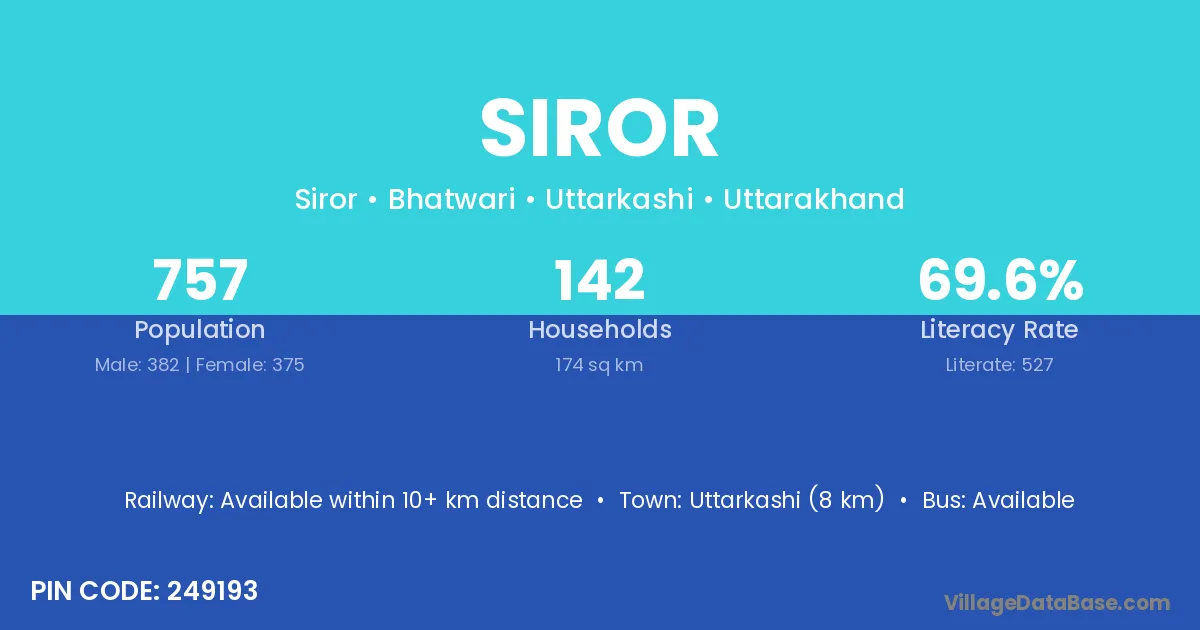 Uttarkashi (8 km) is the nearest town to Siror village for major economic activities and is located approximately 8 km away.