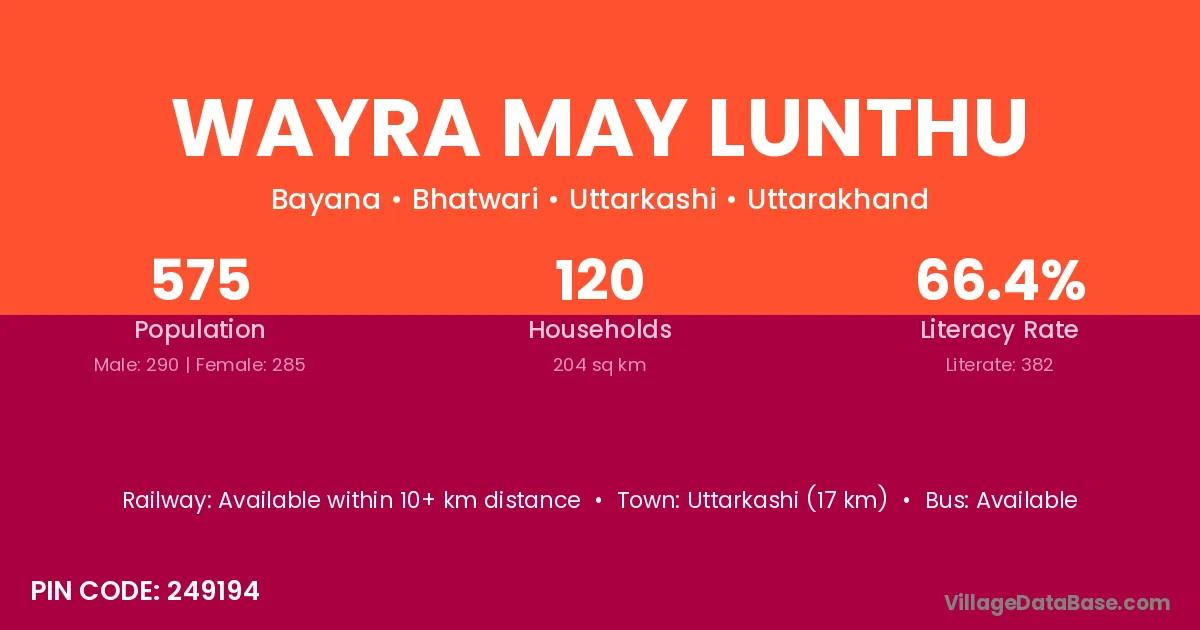 Uttarkashi (17 km) is the nearest town to Wayra May Lunthu village for major economic activities and is located approximately 17 km away.
