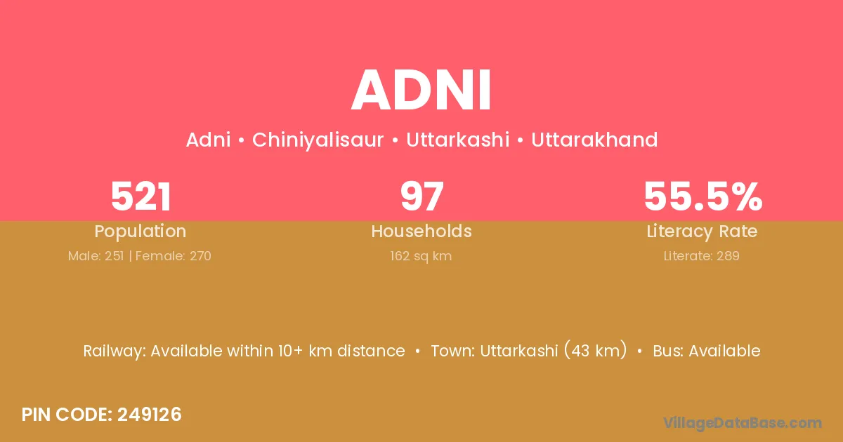 Uttarkashi (43 km) is the nearest town to Adni village for major economic activities and is located approximately 43 km away.
