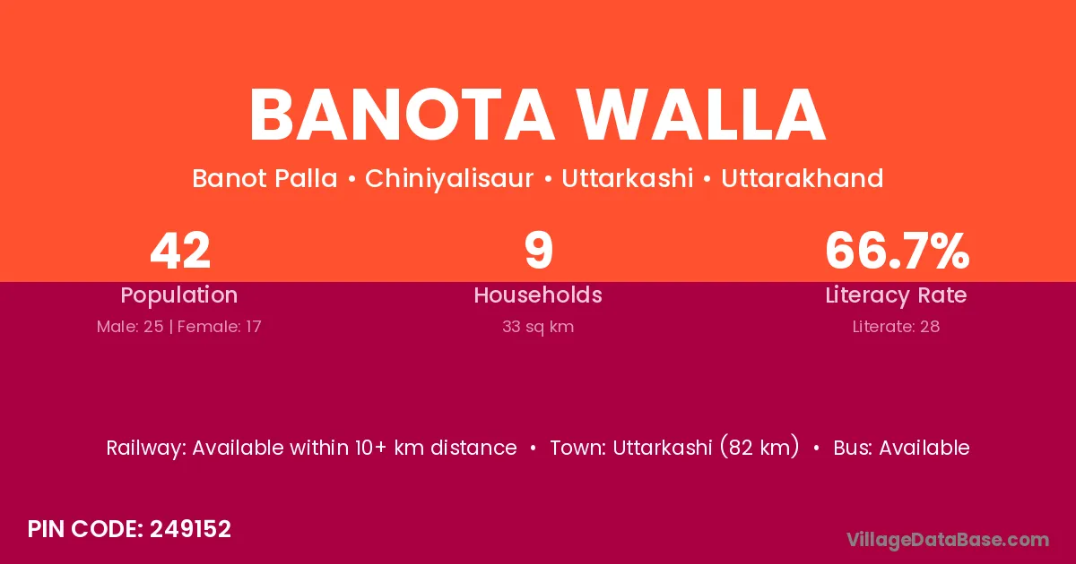 Uttarkashi (82 km) is the nearest town to Banota Walla village for major economic activities and is located approximately 82 km away.