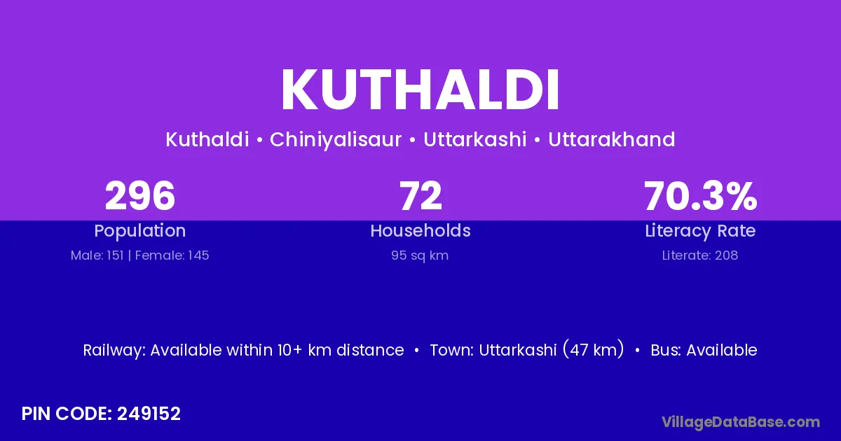 Uttarkashi (47 km) is the nearest town to Kuthaldi village for major economic activities and is located approximately 47 km away.