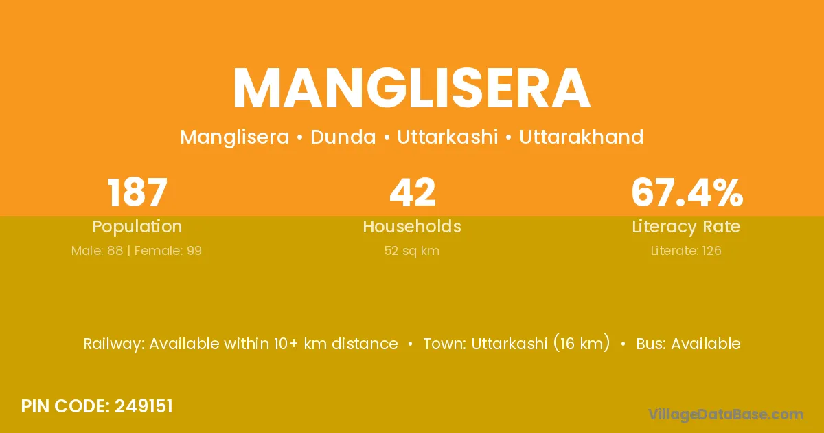 Uttarkashi (16 km) is the nearest town to Manglisera village for major economic activities and is located approximately 16 km away.