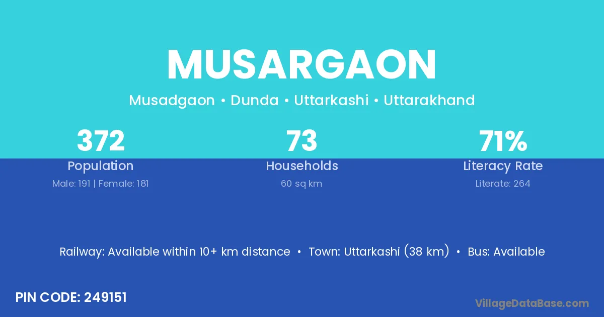 Uttarkashi (38 km) is the nearest town to Musargaon village for major economic activities and is located approximately 38 km away.