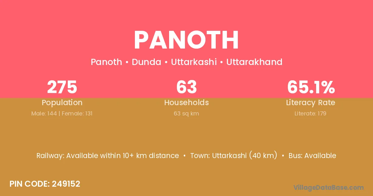 Uttarkashi (40 km) is the nearest town to Panoth village for major economic activities and is located approximately 40 km away.