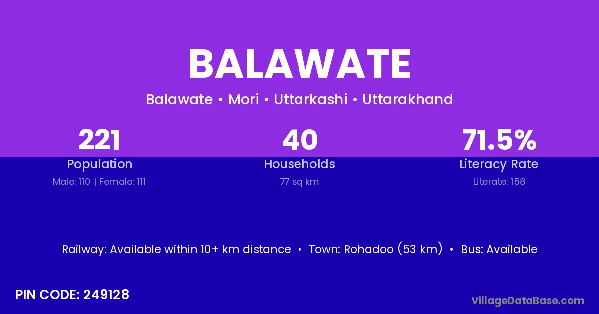 Rohadoo (53 km) is the nearest town to Balawate village for major economic activities and is located approximately 53 km away.