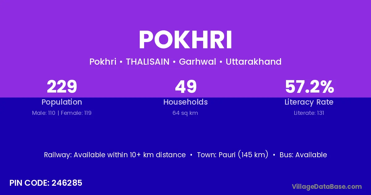 Barkot (62 km) is the nearest town to Pokhri village for major economic activities and is located approximately 62 km away.