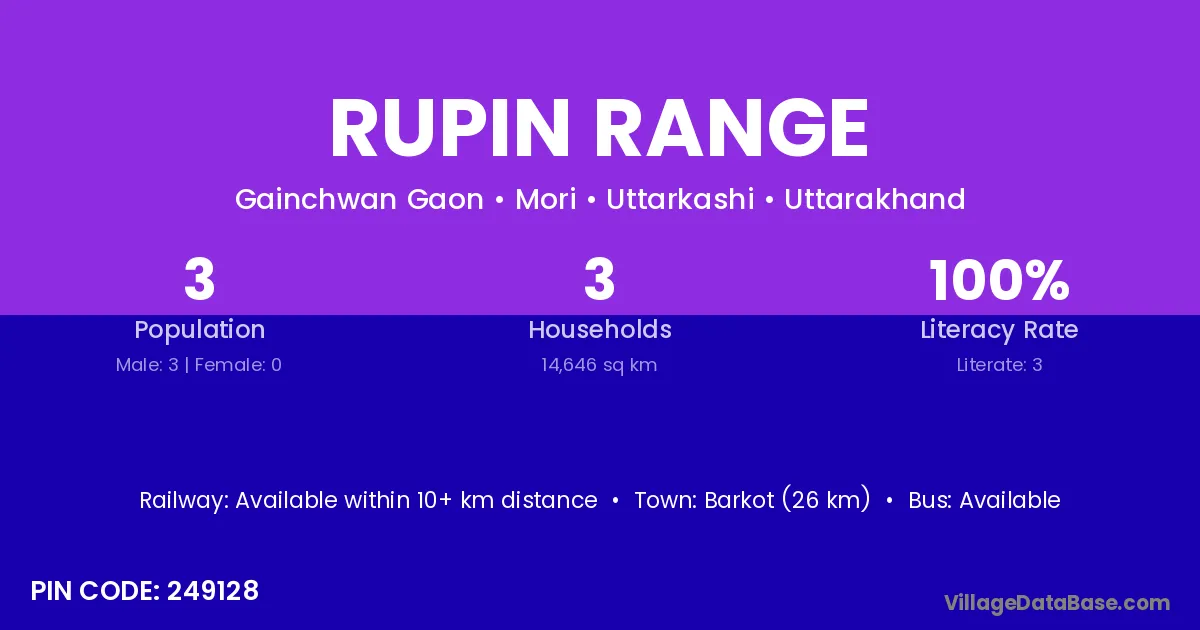 Barkot (26 km) is the nearest town to Rupin Range village for major economic activities and is located approximately 26 km away.