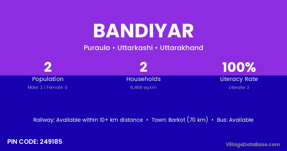 Barkot (70 km) is the nearest town to Bandiyar village for major economic activities and is located approximately 70 km away.