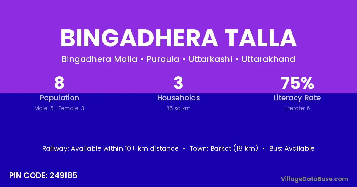 Barkot (18 km) is the nearest town to Bingadhera Talla village for major economic activities and is located approximately 18 km away.