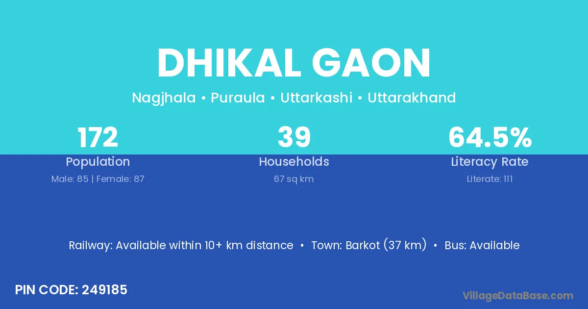 Barkot (37 km) is the nearest town to Dhikal Gaon village for major economic activities and is located approximately 37 km away.